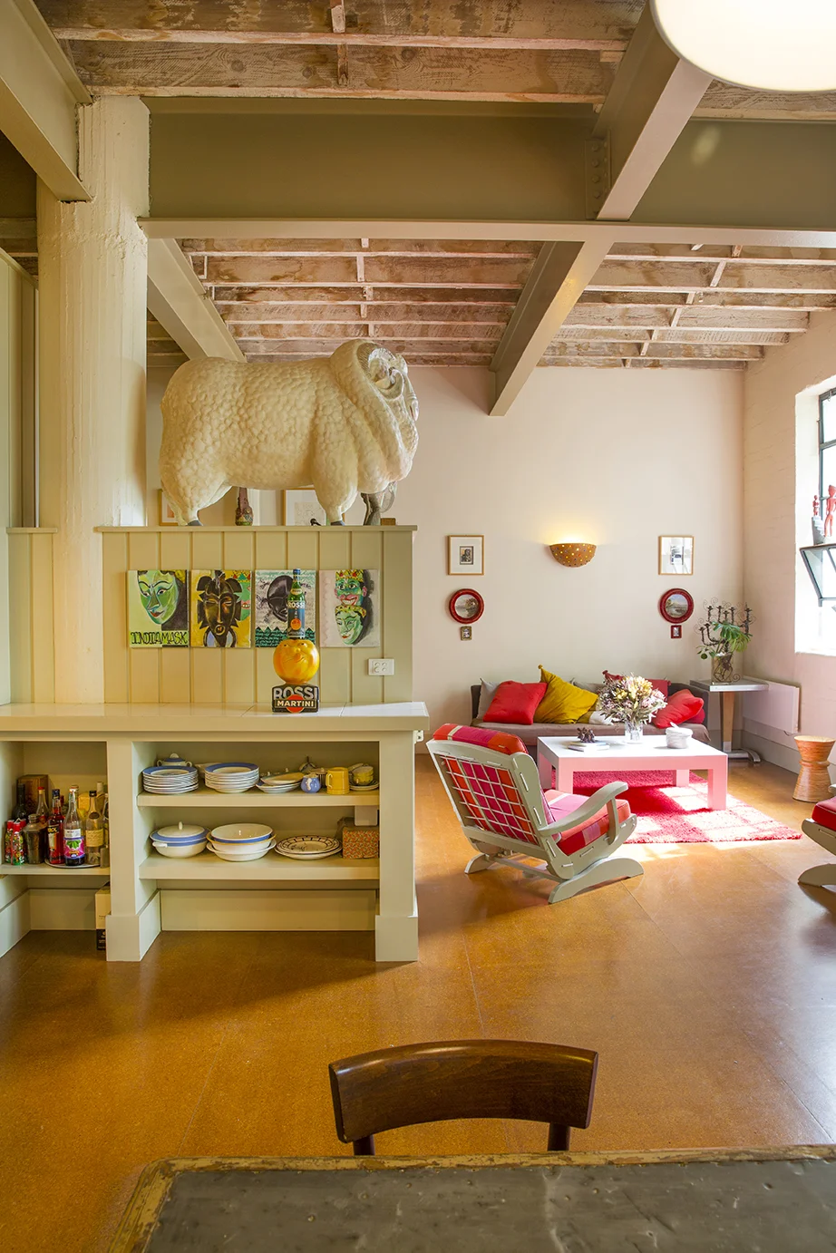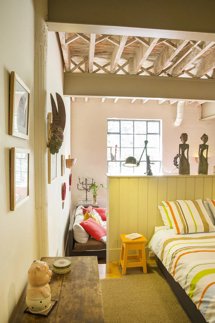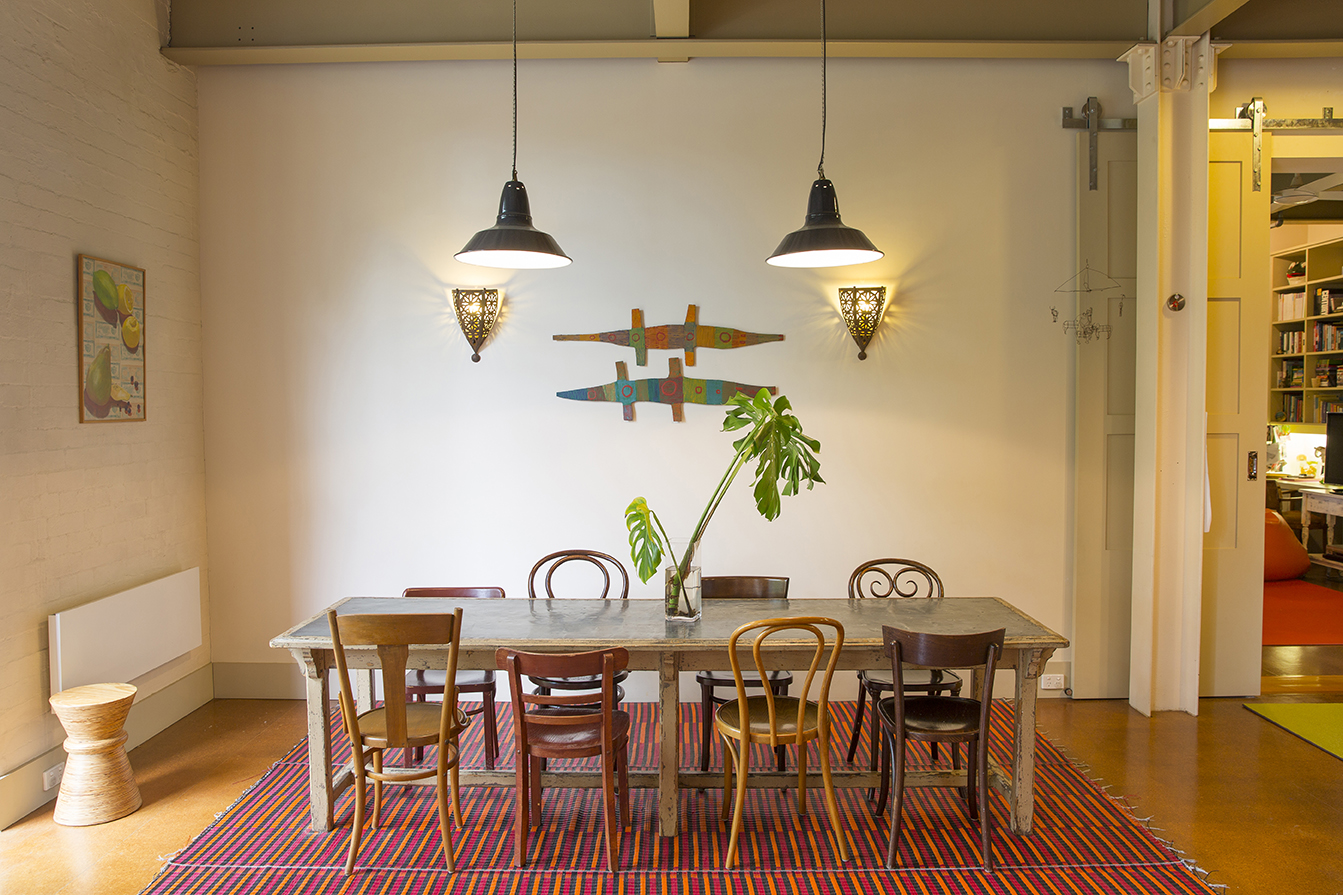 This was a two stage project in a former MacRoberston chocolate factory. The first apartment was 100m2 and constructed for a working couple. The idea was to create intimate spaces while maintaining the open-ness of a warehouse and maintaining features such as the exposed steel beams and wooden trusses of the 4 metre high ceilings. A bedroom and bathroom were cleverly built into a mezzanine and an L-shaped living, meals and kitchen area were designed with a large walk-in pantry.